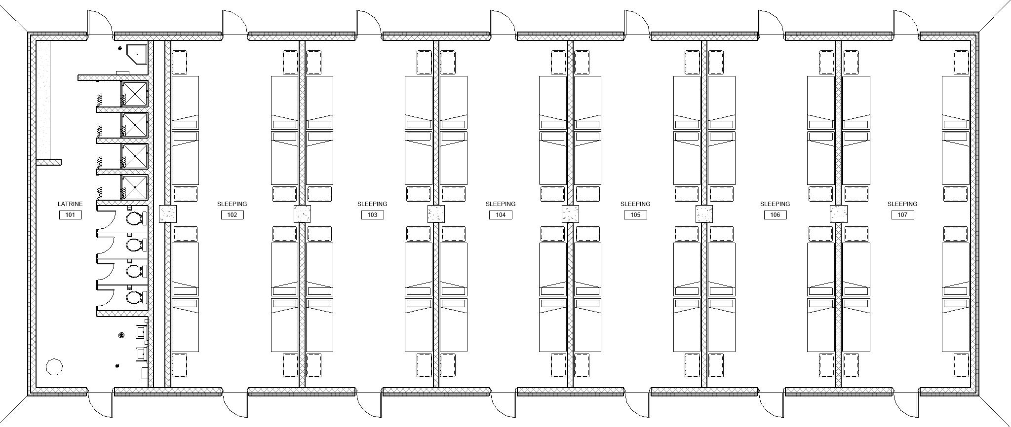 Billeting Option 1 is 14 Bay, Full Floor Semi-open barracks with Latrine/Shower for up to 48 PN total, 8 PN per room.